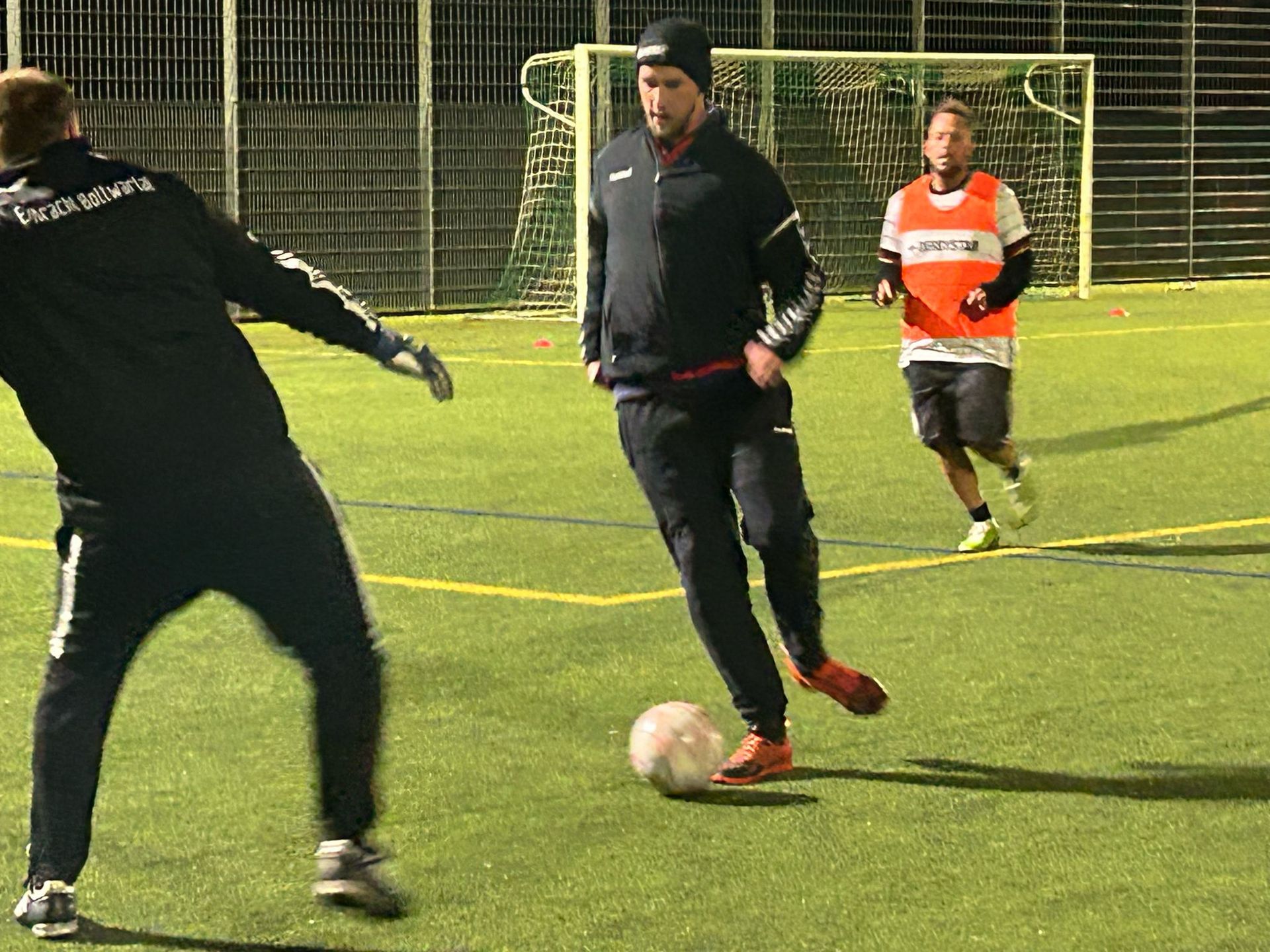 mit Kunstrasen und Flutlicht